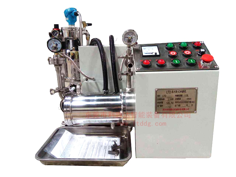 利腾达LTD1.5B/CE实验用砂磨机原理:经过预分散的物料由砂磨机物料输送泵送入砂磨机筒体内,砂磨机电动机通过三角带带动砂磨机分散轴及分散轴上的分散盘做高速旋转,分散盘将其高速旋转动能传递给泵入的物料和预先填充筒体内的研磨介质,使它们相互冲击碰撞碾压、摩擦剪切,使物料得以研磨和分散。