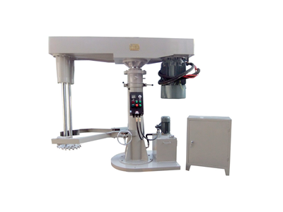 2.接通电源,起动油泵电机,使机架上升到适当的高度,然后将装入浆料的容器放在分散机盘的下方,将机架徐徐下降,使分散盘插入容器内适当深度位置,待下降停止后,即可启动主电机,对容器内的浆料进行搅拌混合和分散。